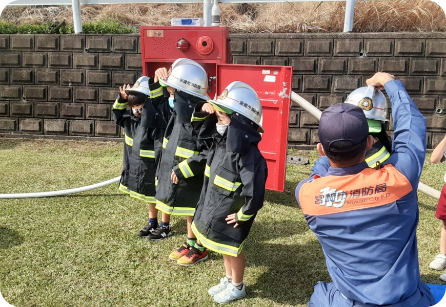 当園では月1回の避難訓練を実施しています。大規模地震を想定した高台への避難訓練も行っています。本園では佐土原総合支所横の佐土原体育館を大規模地震時の避難場所としています。また、各クラスに非常食と非常用水を設置しています。